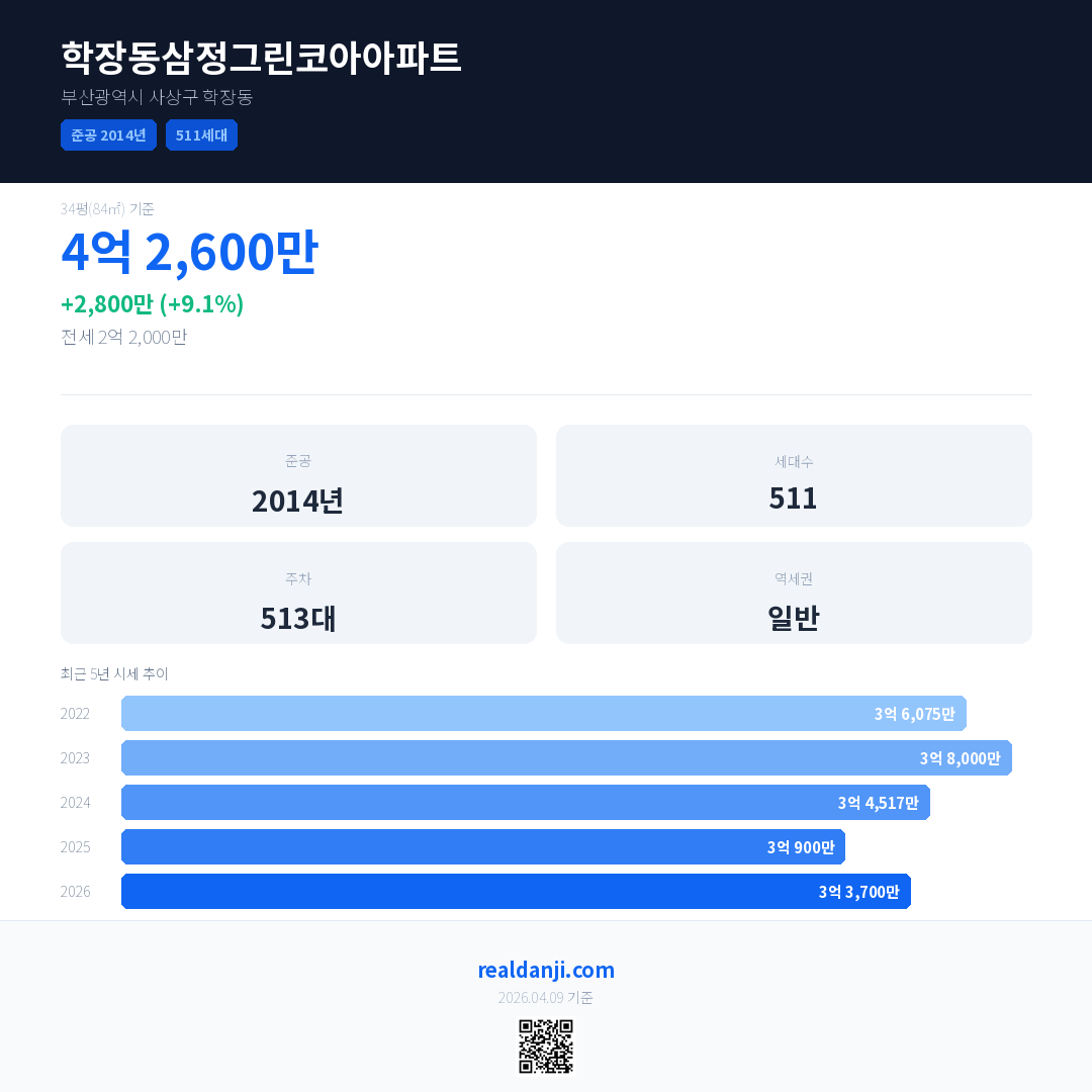 학장동삼정그린코아아파트 국민평형 기준 2026년 평균 거래가는 3억 3,700만으로, 전년 대비 9.1% 상승 했습니다.
