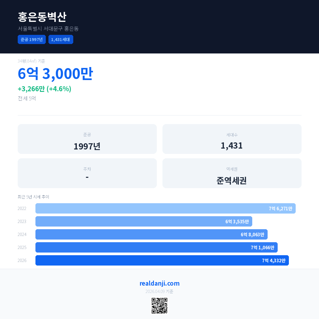 홍은동벽산 국민평형 기준 2026년 평균 거래가는 7억 4,332만으로, 전년 대비 4.6% 상승 했습니다.