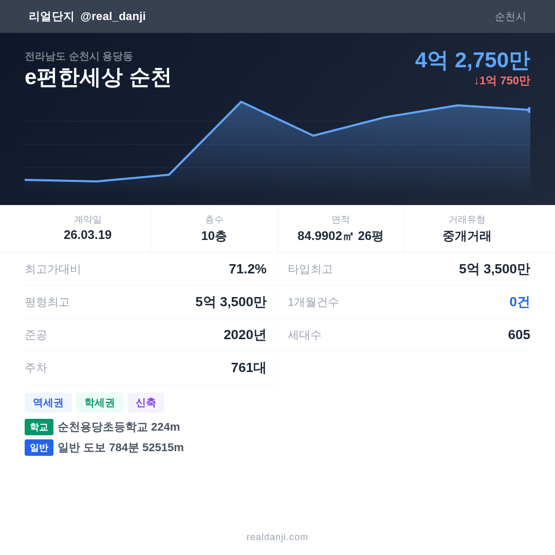 e편한세상 순천은(는) 2020년에 준공되었으며, 현재 6년차입니다. 총 605세대 규모입니다.