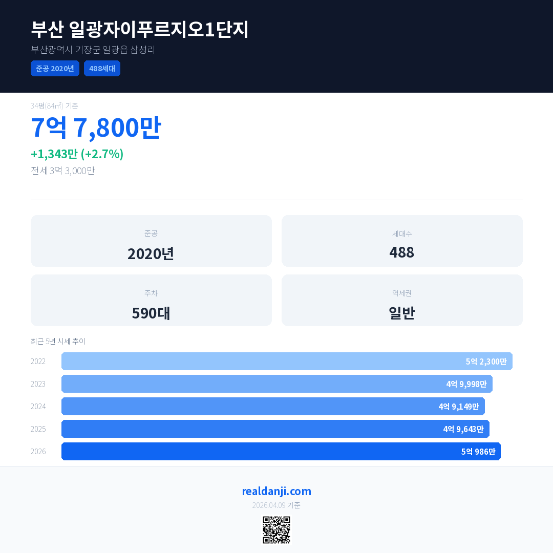 부산 일광자이푸르지오1단지 최근 거래가는 5억 800만입니다. (2026-03)