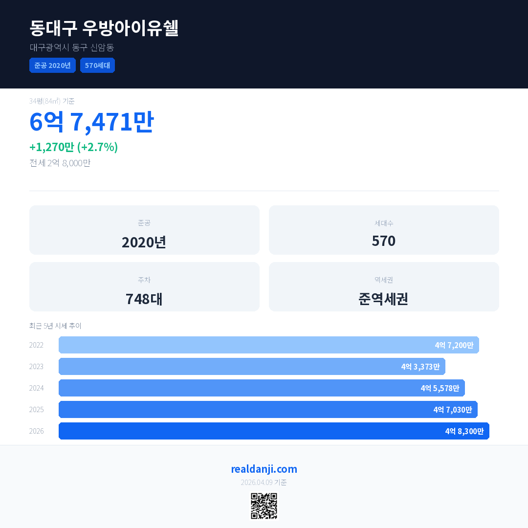 동대구 우방아이유쉘 국민평형 기준 2026년 평균 거래가는 4억 8,300만으로, 전년 대비 2.7% 상승 했습니다.