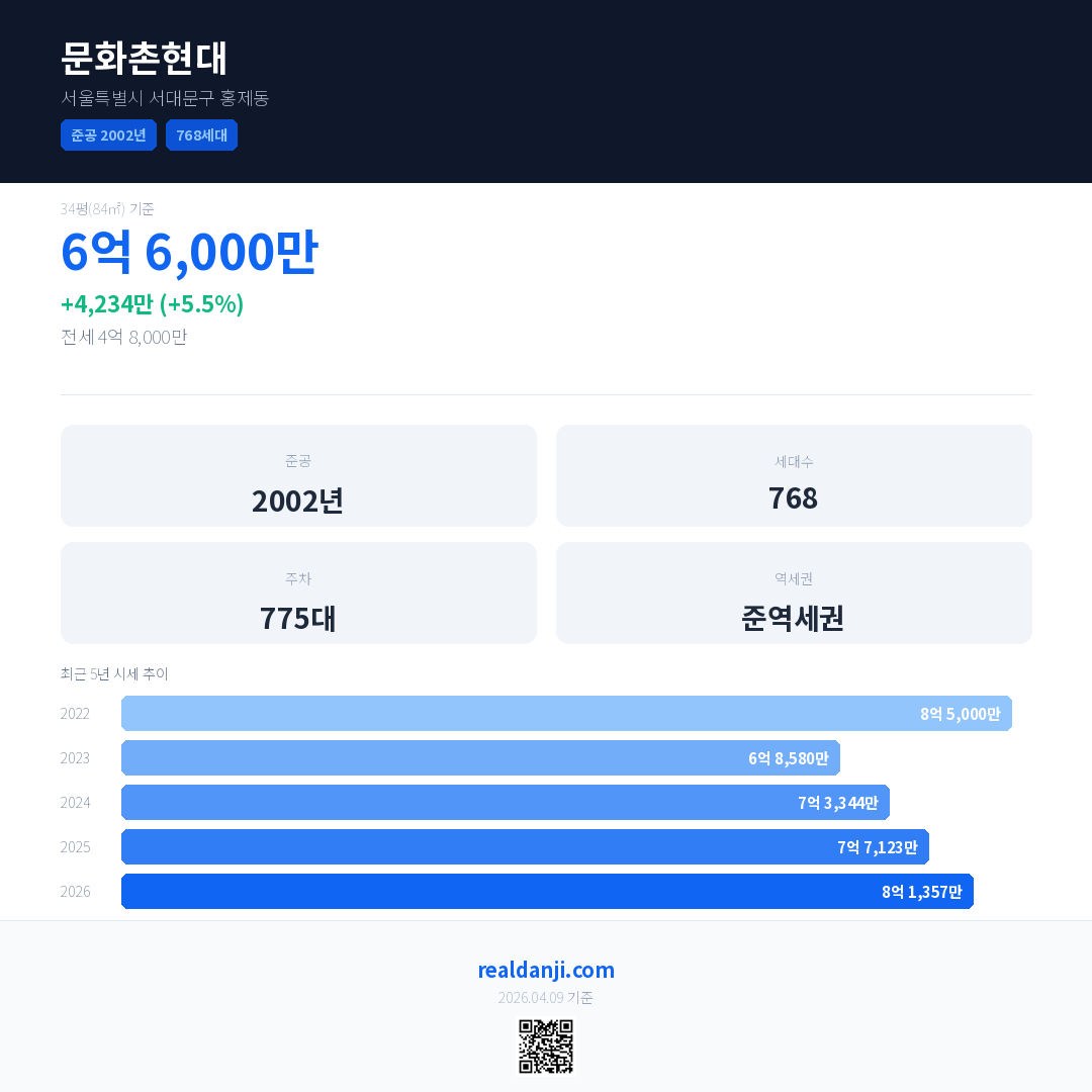 문화촌현대 국민평형 기준 2026년 평균 거래가는 8억 1,357만으로, 전년 대비 5.5% 상승 했습니다.