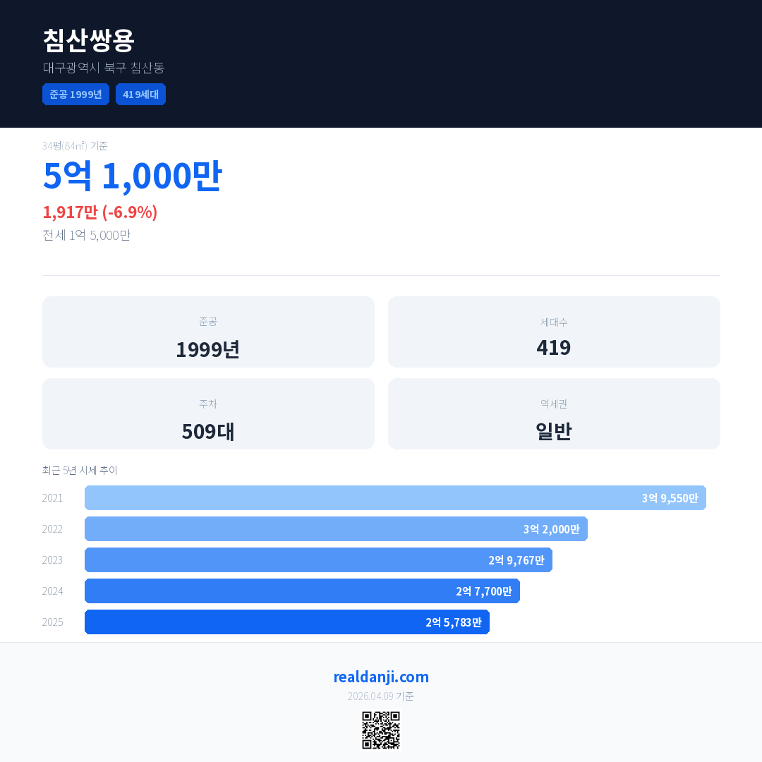 침산쌍용 최근 거래가는 5억 1,000만입니다. (2025-12)