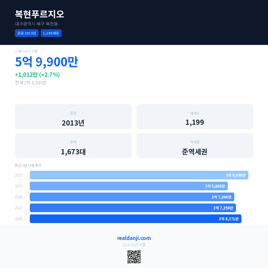 복현푸르지오 최근 거래가는 5억 9,900만입니다. (2026-04)