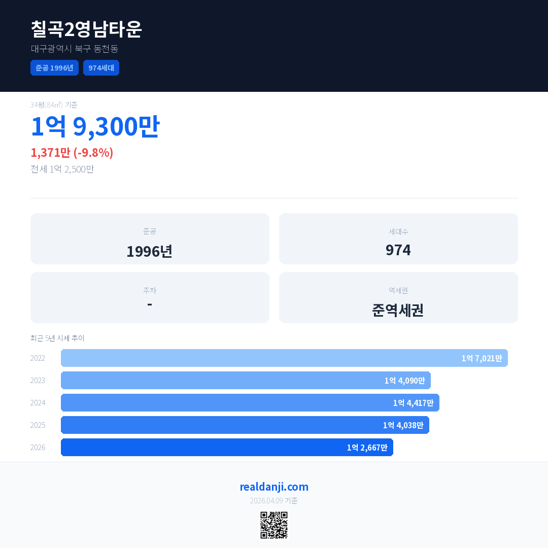 칠곡2영남타운 최근 거래가는 1억 9,300만입니다. (2026-03)