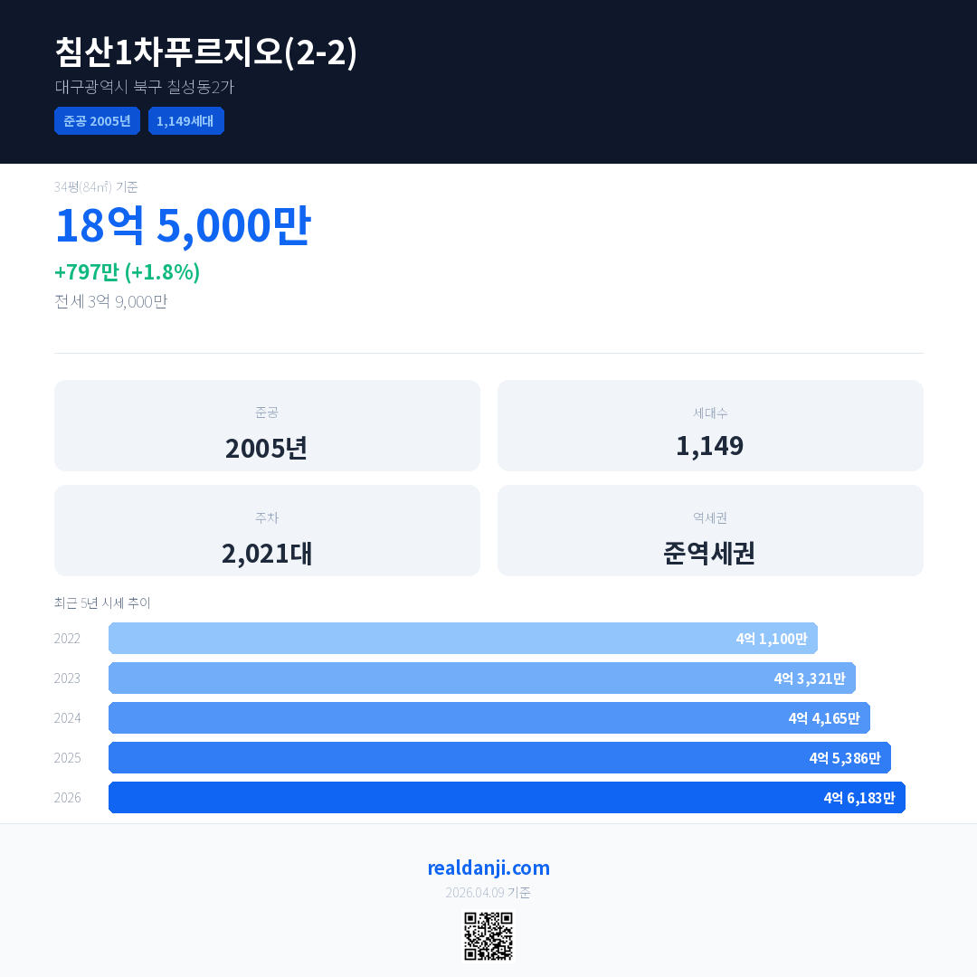 침산1차푸르지오(2-2) 최근 거래가는 18억 5,000만입니다. (2026-03)