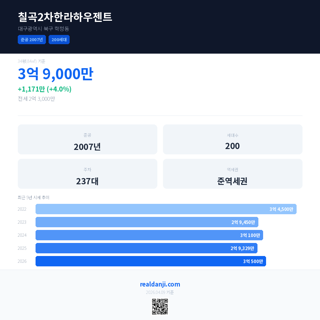 칠곡2차한라하우젠트 최근 거래가는 3억 9,000만입니다. (2026-02)