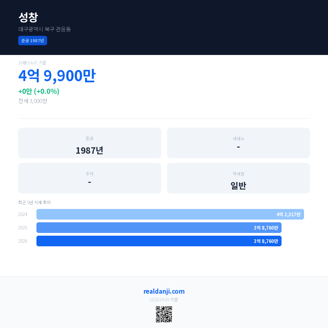 성창 국민평형 기준 2026년 평균 거래가는 3억 8,760만으로, 전년 대비 0.0% 하락 했습니다.
