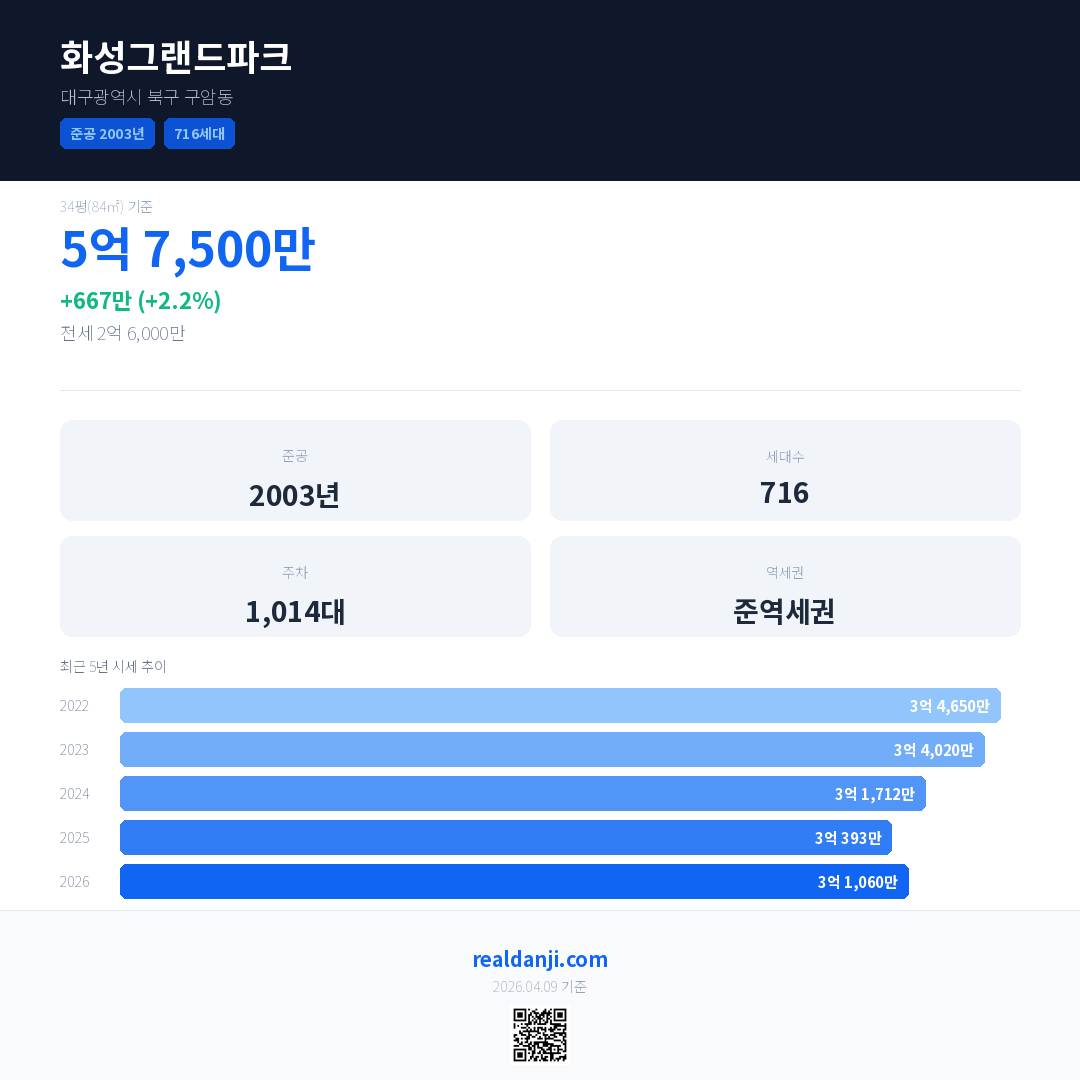 화성그랜드파크 국민평형 기준 2026년 평균 거래가는 3억 1,060만으로, 전년 대비 2.2% 상승 했습니다.