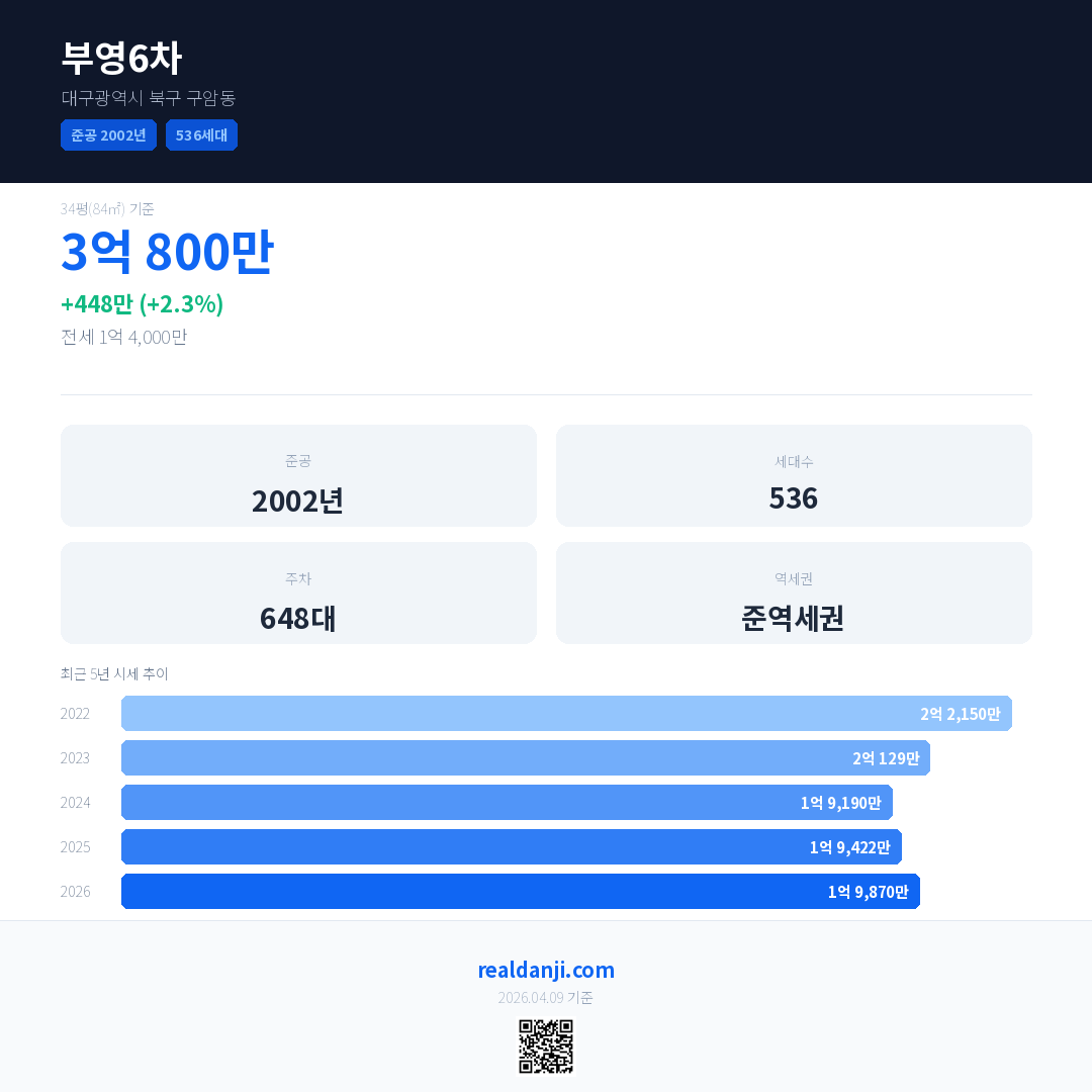 부영6차 국민평형 기준 2026년 평균 거래가는 1억 9,870만으로, 전년 대비 2.3% 상승 했습니다.