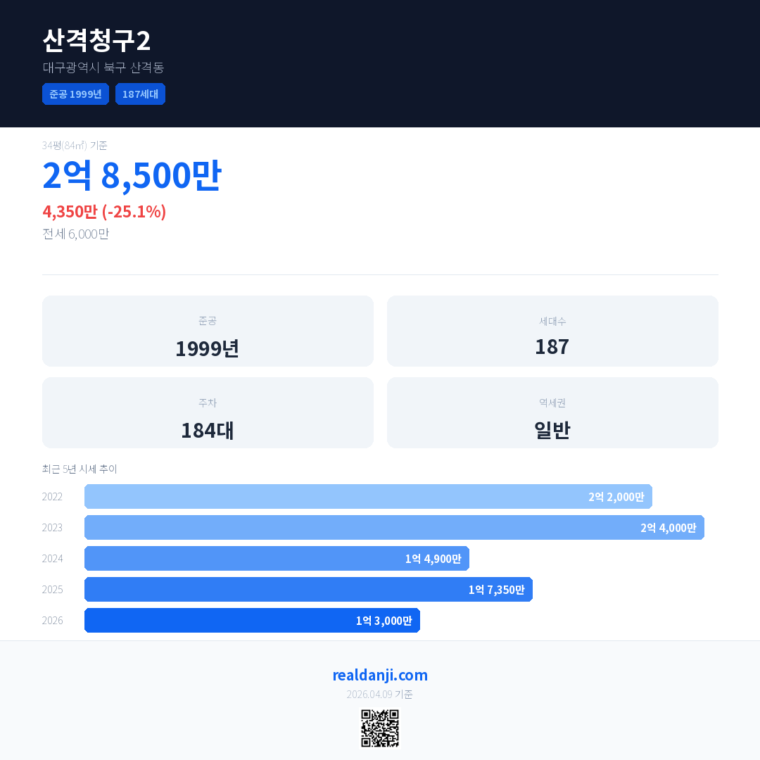 산격청구2은(는) 1999년에 준공되었으며, 현재 27년차입니다. 총 187세대 규모입니다.