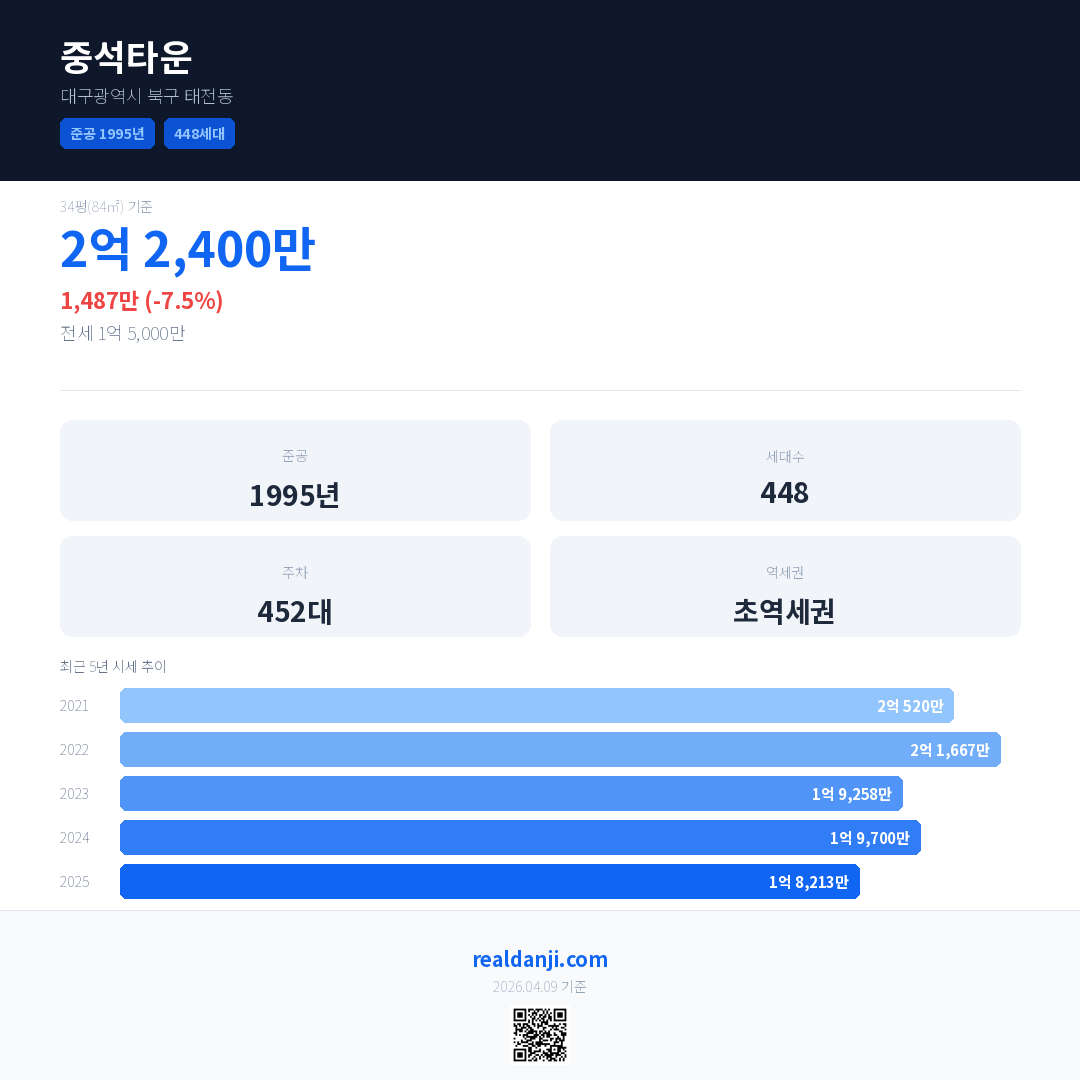중석타운 국민평형 기준 2025년 평균 거래가는 1억 8,213만으로, 전년 대비 7.5% 하락 했습니다.