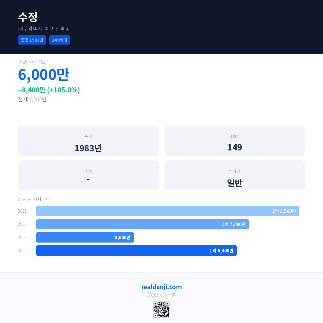 수정 국민평형 기준 2024년 평균 거래가는 1억 6,400만으로, 전년 대비 105.0% 상승 했습니다.