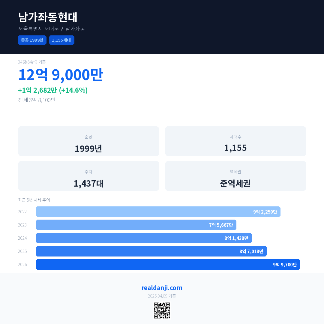 남가좌동현대 국민평형 기준 2026년 평균 거래가는 9억 9,700만으로, 전년 대비 14.6% 상승 했습니다.