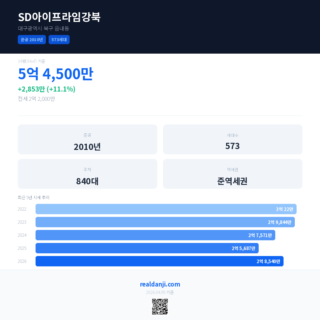 SD아이프라임강북은(는) 2010년에 준공되었으며, 현재 16년차입니다. 총 573세대 규모입니다.