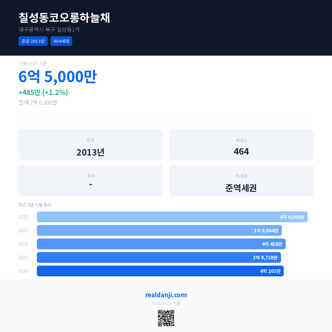 칠성동코오롱하늘채 국민평형 기준 2026년 평균 거래가는 4억 203만으로, 전년 대비 1.2% 상승 했습니다.