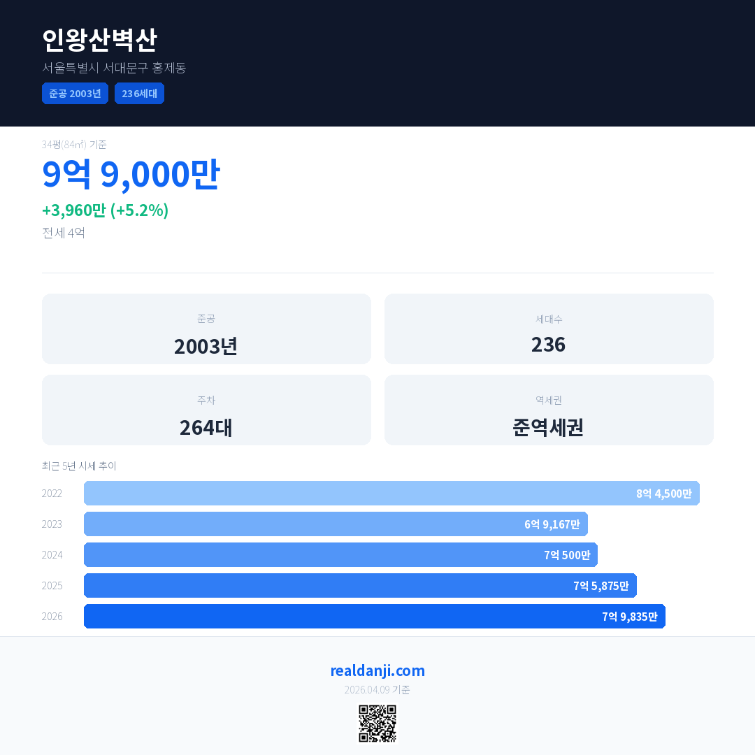 인왕산벽산 국민평형 기준 2026년 평균 거래가는 7억 9,835만으로, 전년 대비 5.2% 상승 했습니다.