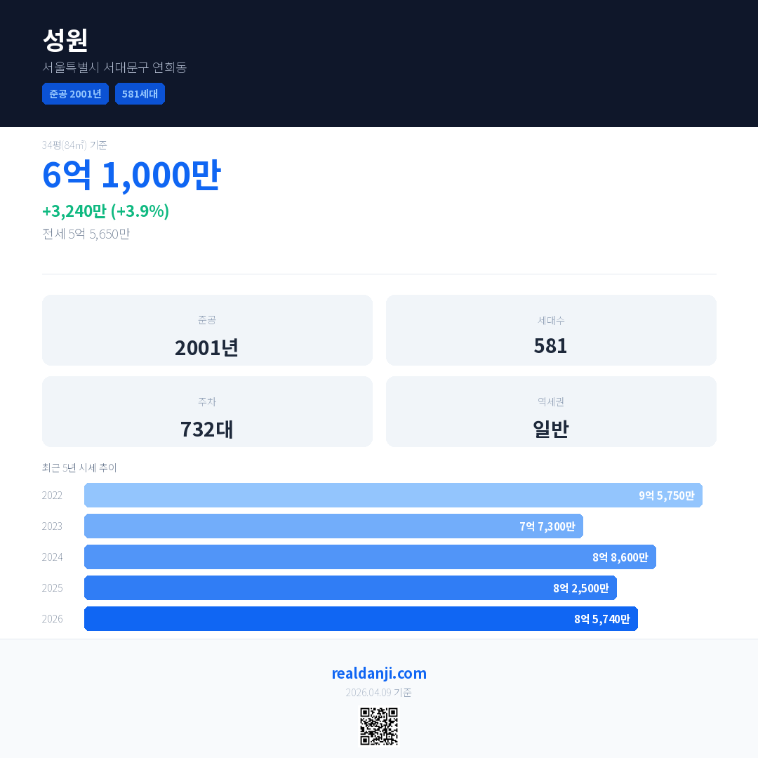 성원은(는) 2001년에 준공되었으며, 현재 25년차입니다. 총 581세대 규모입니다.