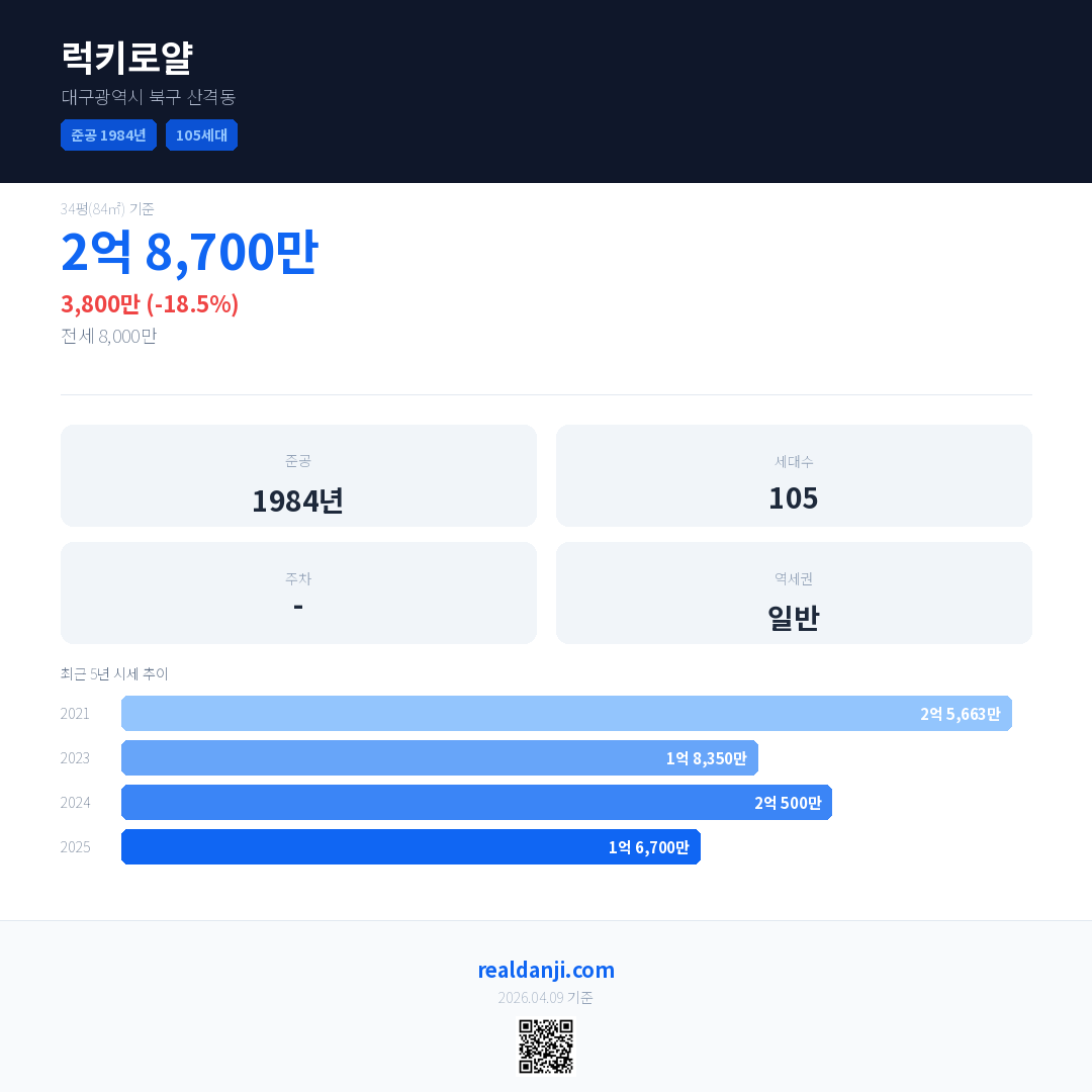 럭키로얄 국민평형 기준 2025년 평균 거래가는 1억 6,700만으로, 전년 대비 18.5% 하락 했습니다.