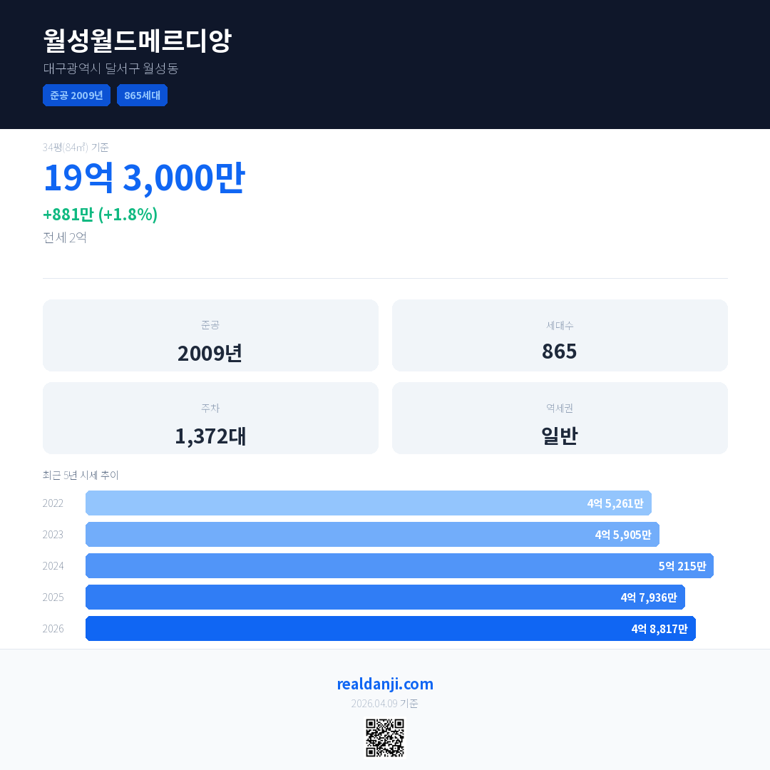 월성월드메르디앙 국민평형 기준 2026년 평균 거래가는 4억 8,817만으로, 전년 대비 1.8% 상승 했습니다.
