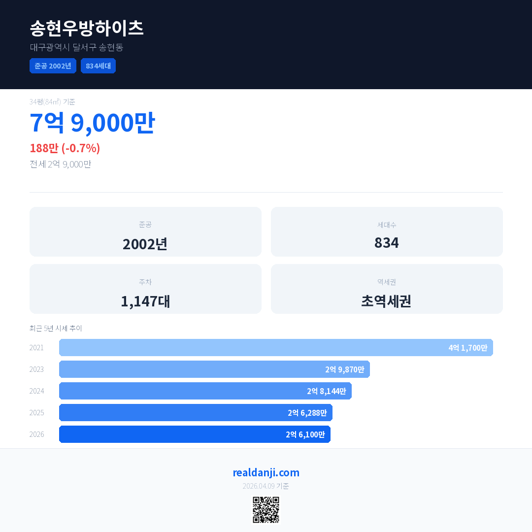 송현우방하이츠 최근 거래가는 7억 9,000만입니다. (2026-03)
