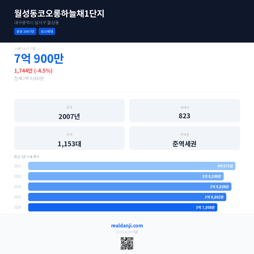 월성동코오롱하늘채1단지 최근 거래가는 7억 900만입니다. (2026-04)