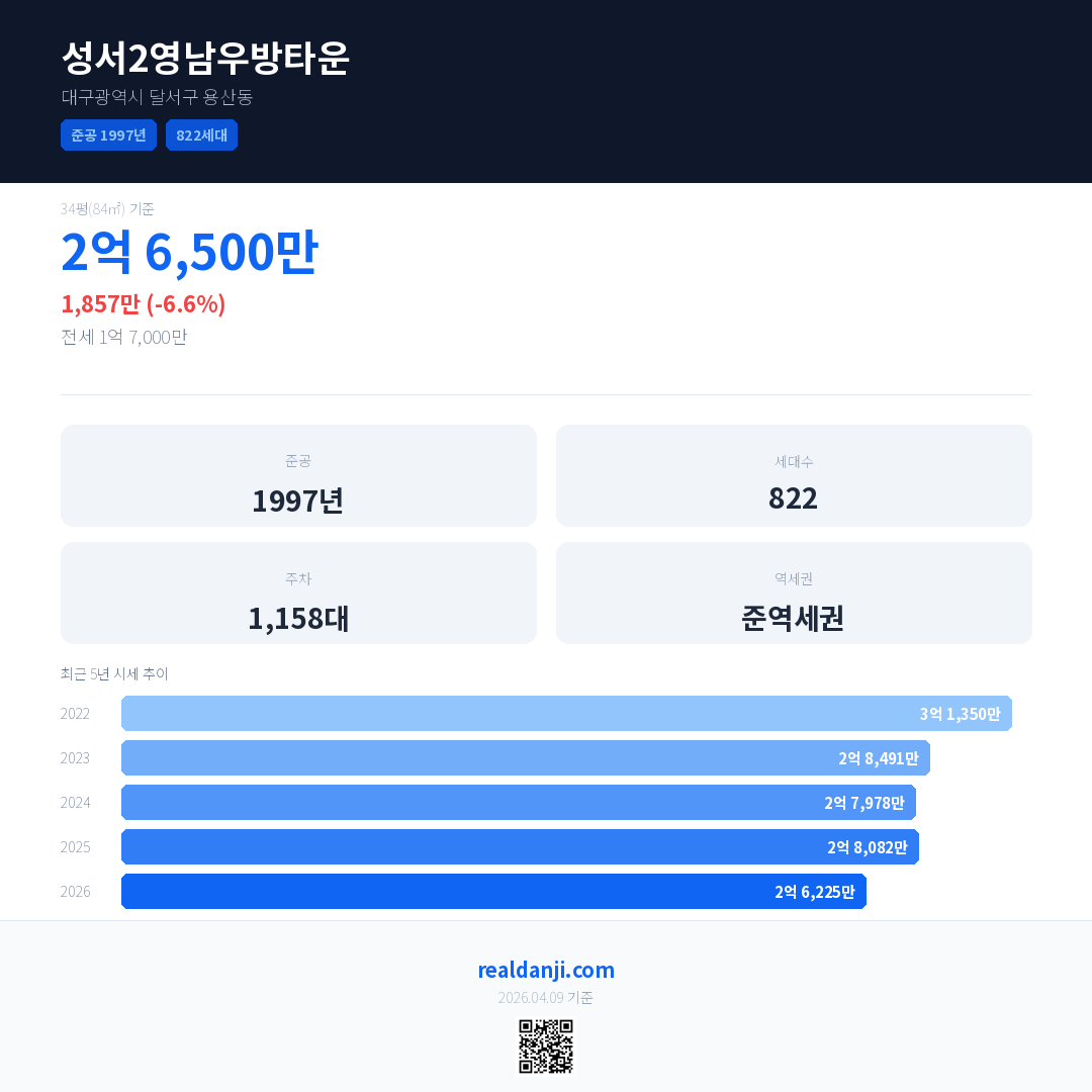 성서2영남우방타운 국민평형 기준 2026년 평균 거래가는 2억 6,225만으로, 전년 대비 6.6% 하락 했습니다.