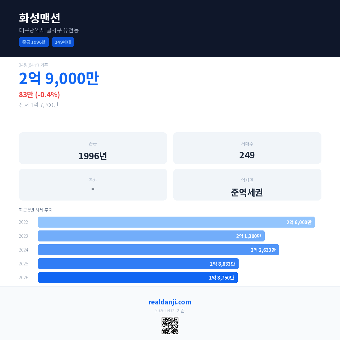 화성맨션 국민평형 기준 2026년 평균 거래가는 1억 8,750만으로, 전년 대비 0.4% 하락 했습니다.