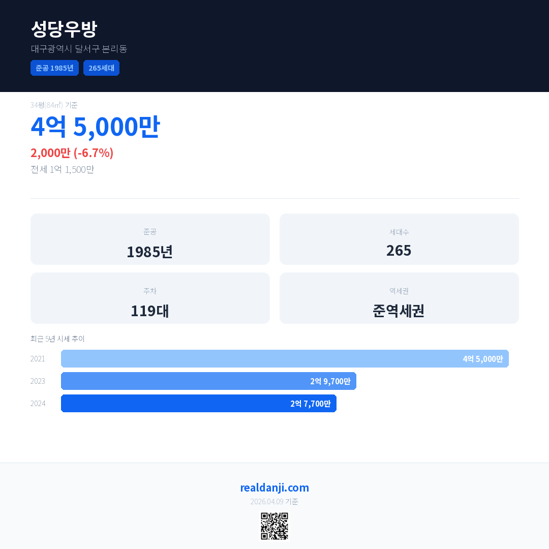 성당우방 국민평형 기준 2024년 평균 거래가는 2억 7,700만으로, 전년 대비 6.7% 하락 했습니다.