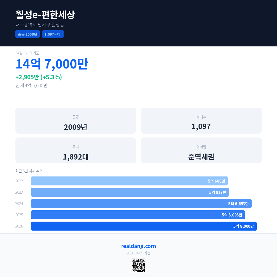 월성e-편한세상 국민평형 기준 2026년 평균 거래가는 5억 8,000만으로, 전년 대비 5.3% 상승 했습니다.
