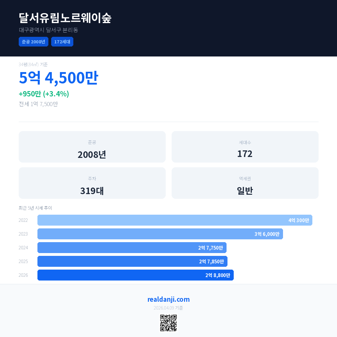 달서유림노르웨이숲 국민평형 기준 2026년 평균 거래가는 2억 8,800만으로, 전년 대비 3.4% 상승 했습니다.