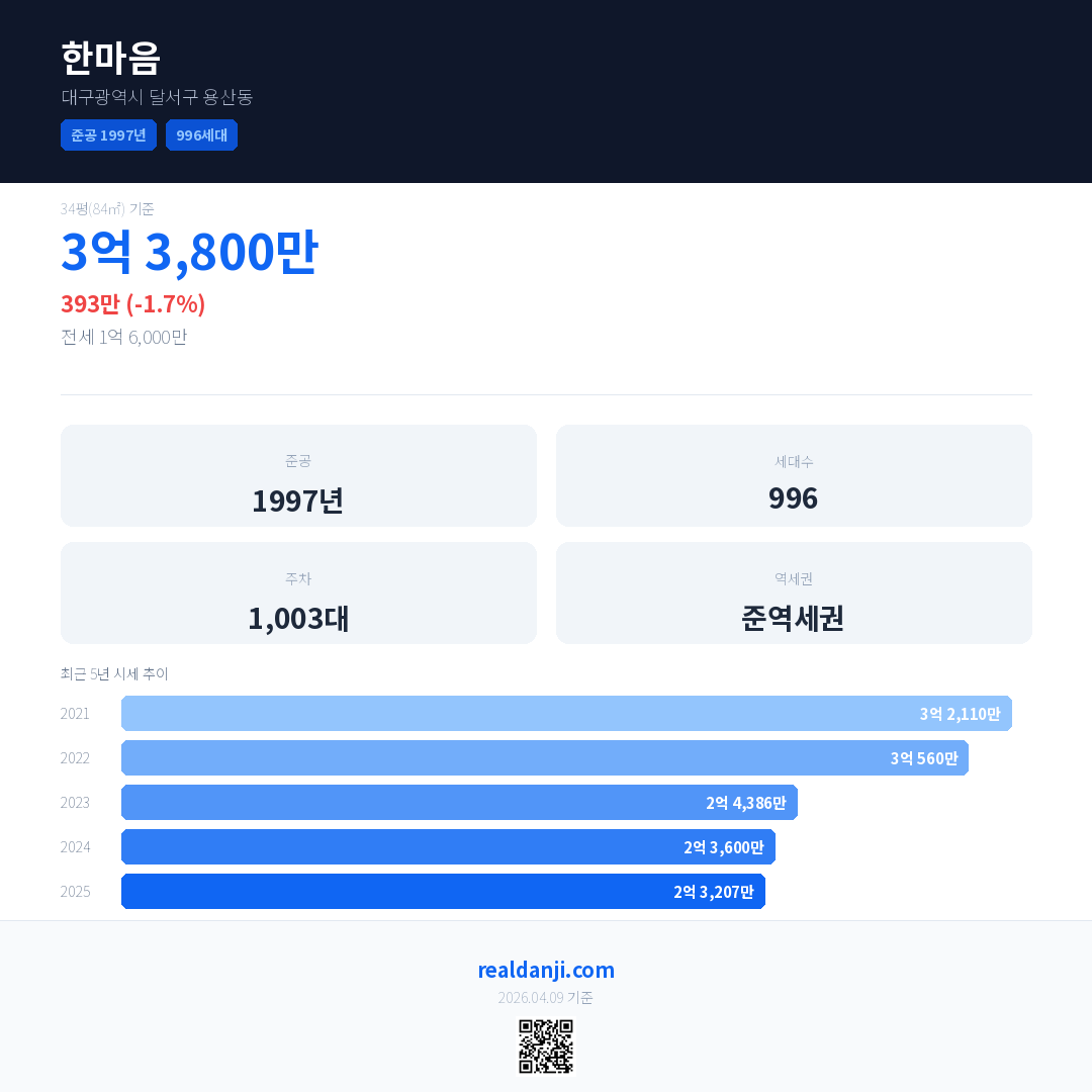 한마음 최근 거래가는 3억 3,800만입니다. (2026-03)