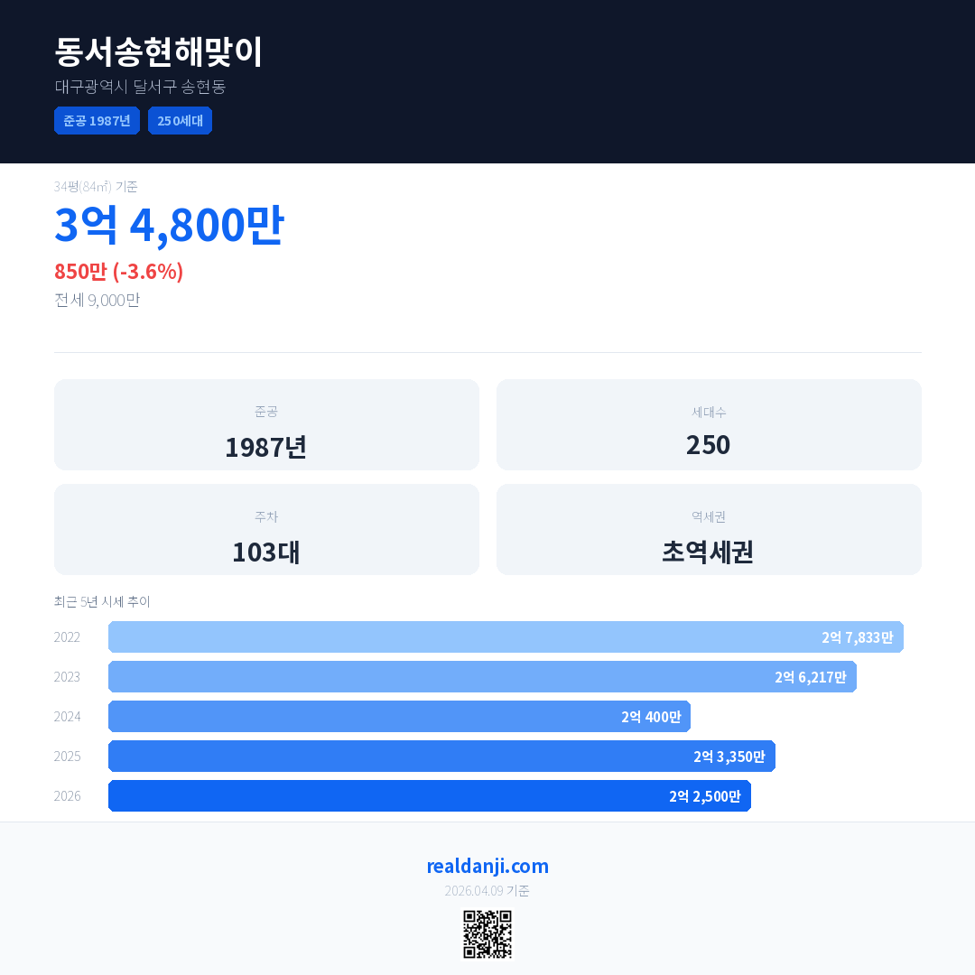 동서송현해맞이은(는) 1987년에 준공되었으며, 현재 39년차입니다. 총 250세대 규모입니다.
