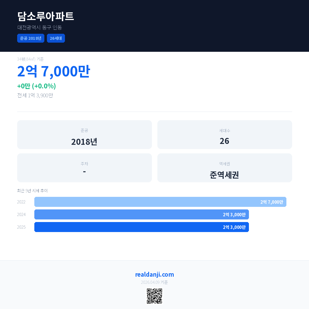 담소루아파트 국민평형 기준 2025년 평균 거래가는 2억 3,000만으로, 전년 대비 0.0% 하락 했습니다.