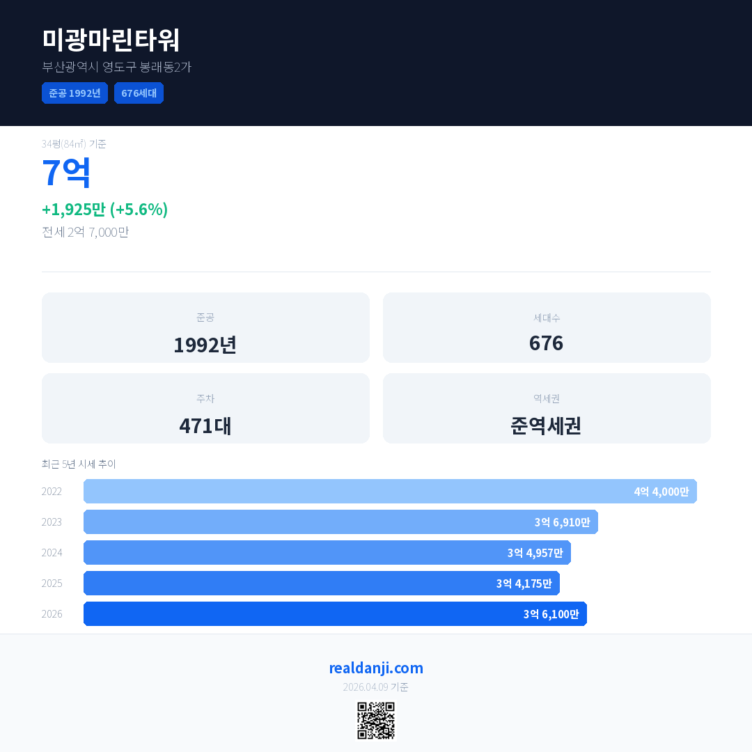 미광마린타워 국민평형 기준 2026년 평균 거래가는 3억 6,100만으로, 전년 대비 5.6% 상승 했습니다.