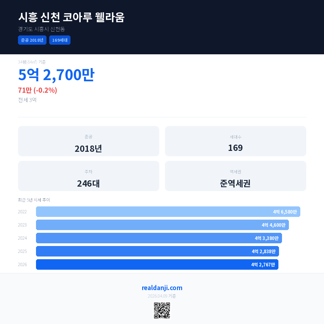 시흥 신천 코아루 웰라움 최근 거래가는 5억 2,700만입니다. (2026-04)