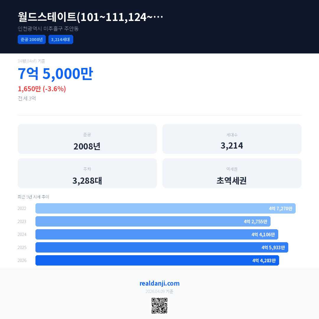 월드스테이트(101~111,124~132) 최근 거래가는 7억 5,000만입니다. (2026-04)