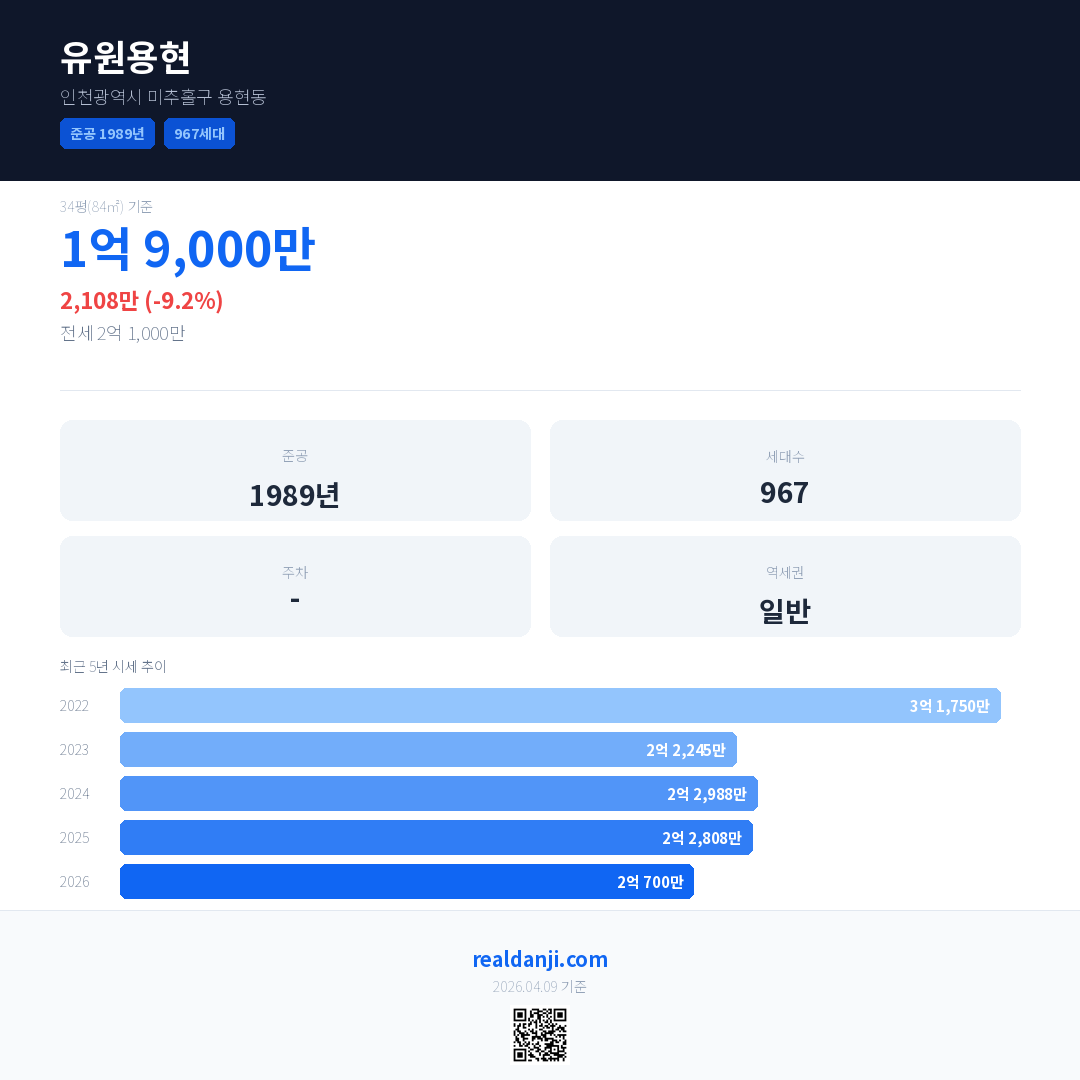 유원용현 국민평형 기준 2026년 평균 거래가는 2억 700만으로, 전년 대비 9.2% 하락 했습니다.