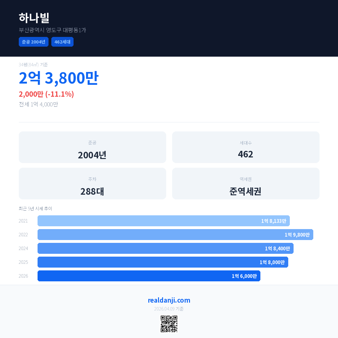 하나빌 국민평형 기준 2026년 평균 거래가는 1억 6,000만으로, 전년 대비 11.1% 하락 했습니다.