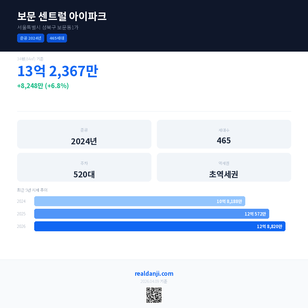 보문 센트럴 아이파크 국민평형 기준 2026년 평균 거래가는 12억 8,820만으로, 전년 대비 6.8% 상승 했습니다.