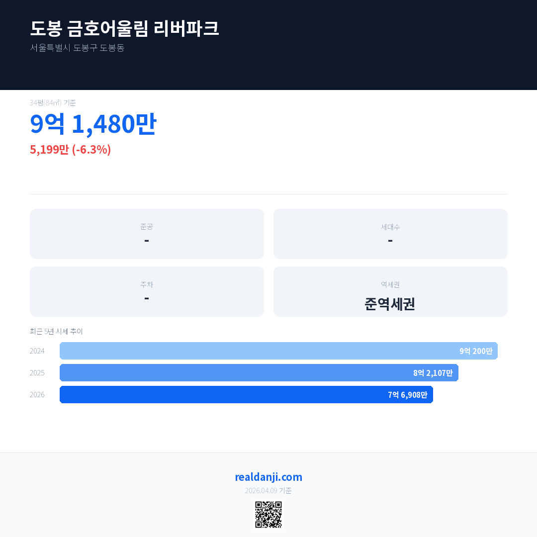 도봉 금호어울림 리버파크 국민평형 기준 2026년 평균 거래가는 7억 6,908만으로, 전년 대비 6.3% 하락 했습니다.