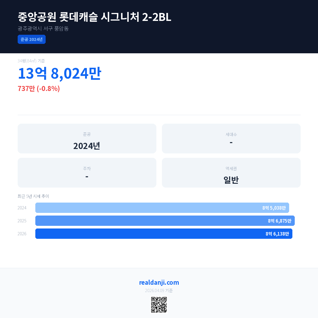 중앙공원 롯데캐슬 시그니처 2-2BL 국민평형 기준 2026년 평균 거래가는 8억 6,138만으로, 전년 대비 0.8% 하락 했습니다.