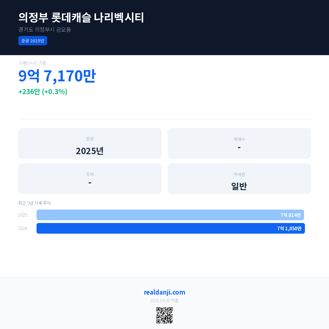 의정부 롯데캐슬 나리벡시티 국민평형 기준 2026년 평균 거래가는 7억 1,050만으로, 전년 대비 0.3% 상승 했습니다.