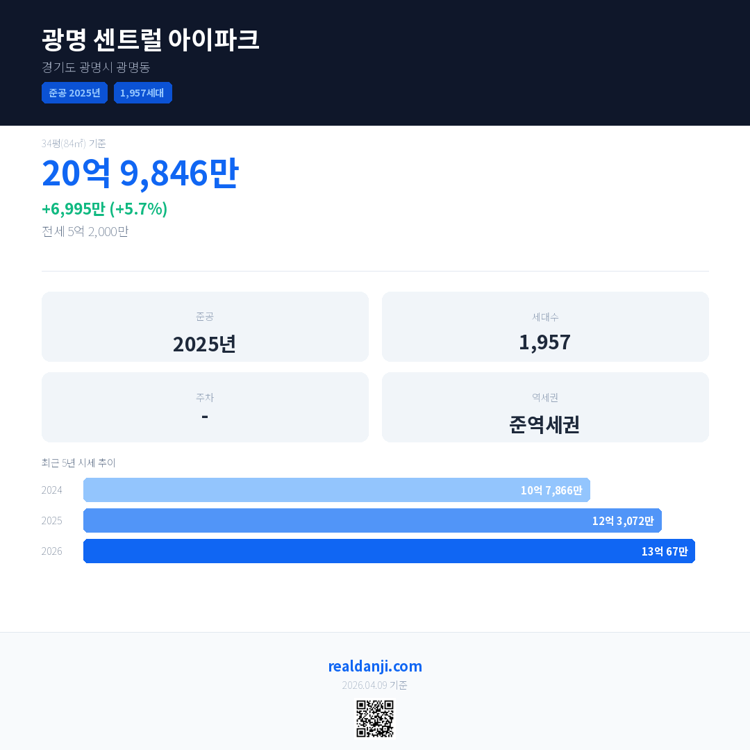 광명 센트럴 아이파크은(는) 2025년에 준공되었으며, 현재 1년차입니다. 총 1,957세대 규모입니다.