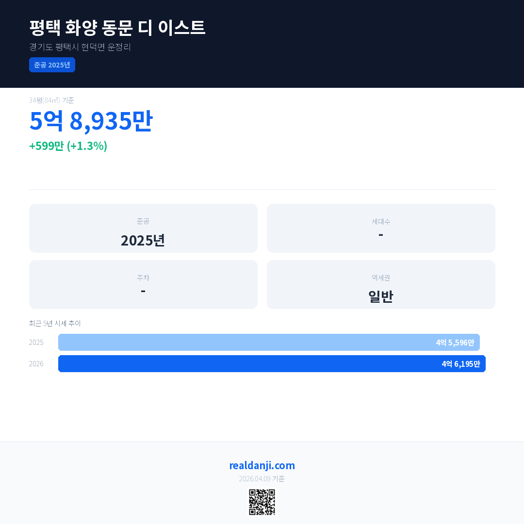 평택 화양 동문 디 이스트 국민평형 기준 2026년 평균 거래가는 4억 6,195만으로, 전년 대비 1.3% 상승 했습니다.