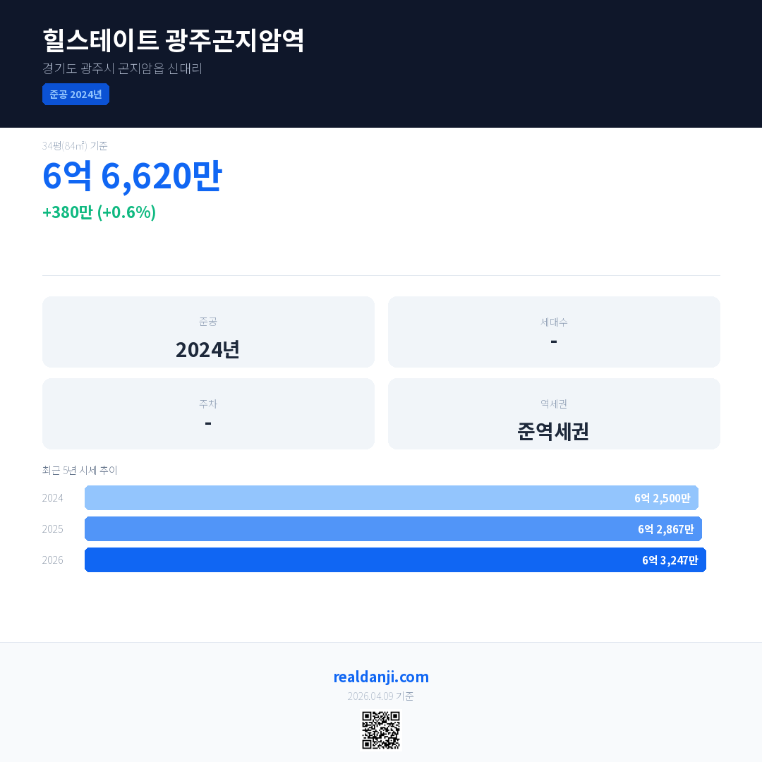 힐스테이트 광주곤지암역 국민평형 기준 2026년 평균 거래가는 6억 3,247만으로, 전년 대비 0.6% 상승 했습니다.