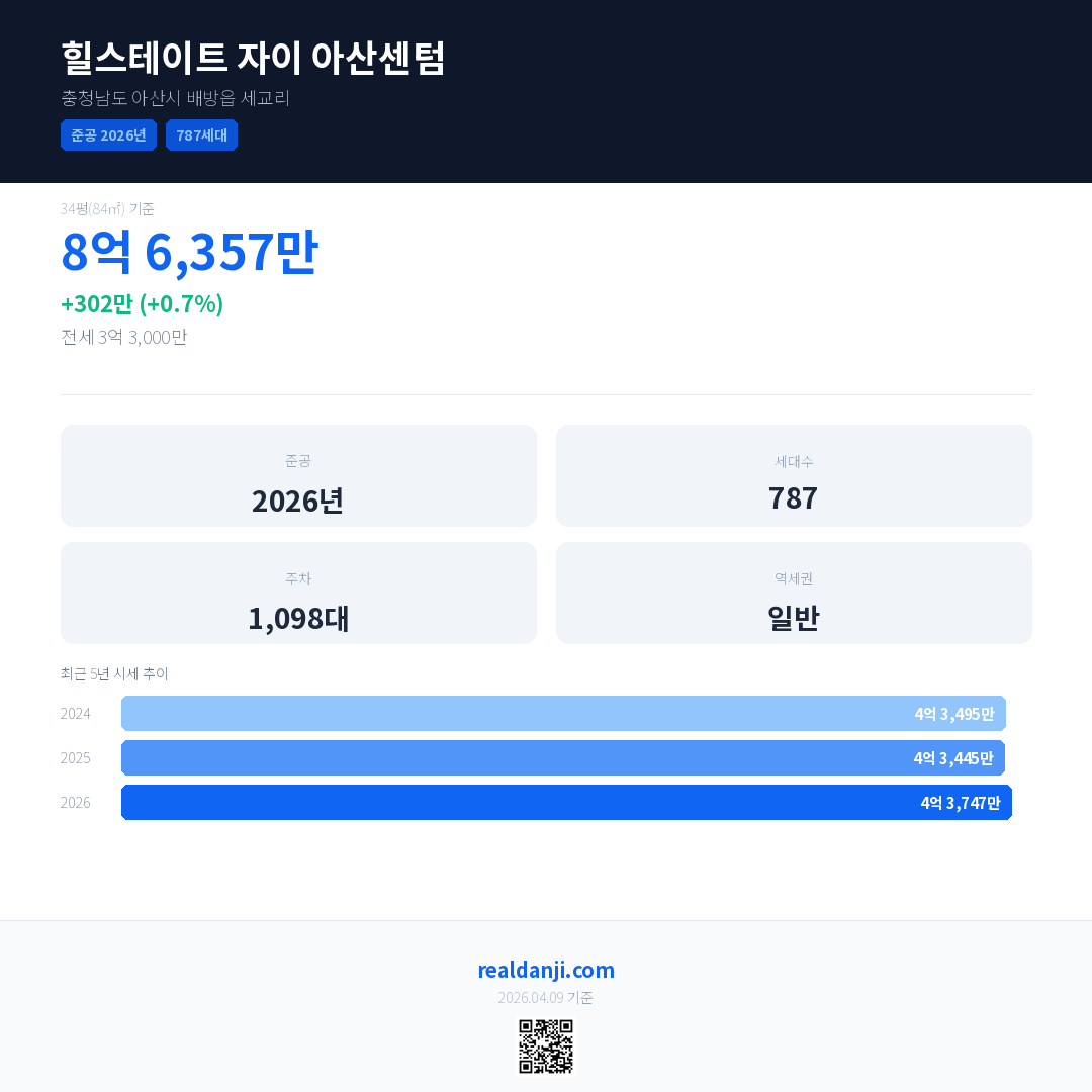 힐스테이트 자이 아산센텀 국민평형 기준 2026년 평균 거래가는 4억 3,747만으로, 전년 대비 0.7% 상승 했습니다.