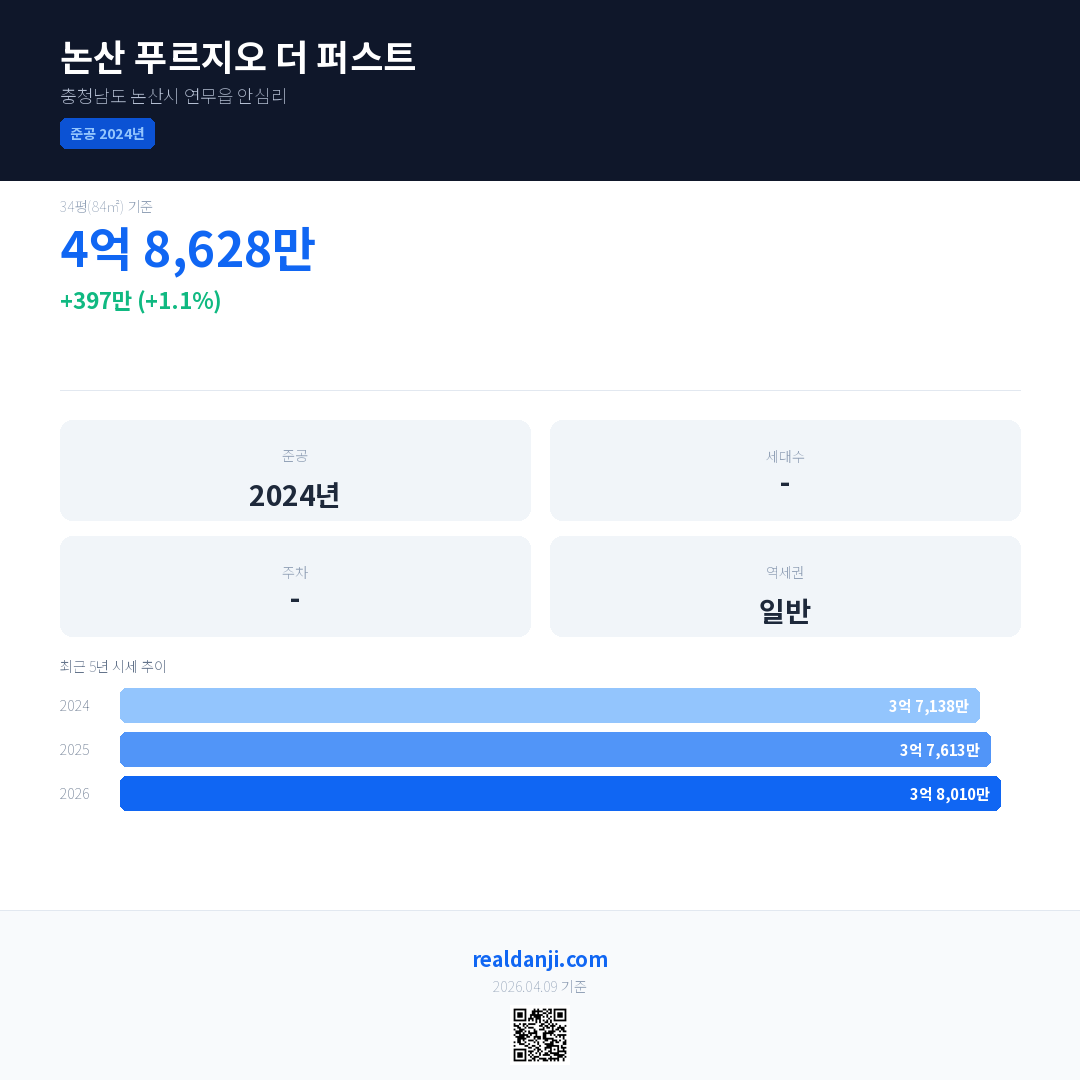 논산 푸르지오 더 퍼스트 국민평형 기준 2026년 평균 거래가는 3억 8,010만으로, 전년 대비 1.1% 상승 했습니다.