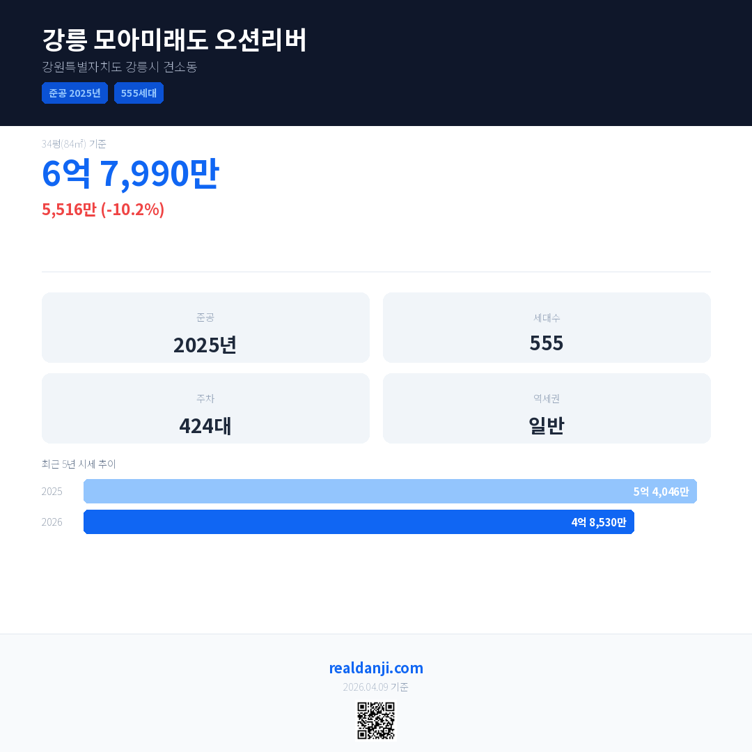 강릉 모아미래도 오션리버 국민평형 기준 2026년 평균 거래가는 4억 8,530만으로, 전년 대비 10.2% 하락 했습니다.