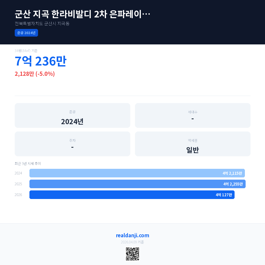 군산 지곡 한라비발디 2차 은파레이크뷰 국민평형 기준 2026년 평균 거래가는 4억 127만으로, 전년 대비 5.0% 하락 했습니다.